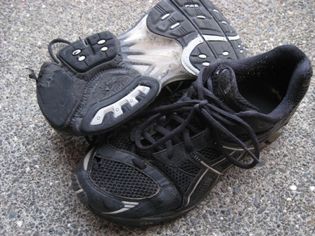 Almennt þykir ekki ráðlegt að hlaupa meira en 800-1.000 km á sömu hlaupaskónum, eða kannski 1.000-1.200 km ef um er að ræða mjög vandaða (og dýra) skó. Þegar þar er komið sögu kvað dempunin í skónum vera farin að gefa sig, og eins hættir sólanum til að slitna eftir því sem kílómetrunum fjölgar. En mér var kennt í æsku að nýtni væri dyggð, og því skirrtist ég við að leggja þessum ágætu skóm þótt kílómetrar þeirra væru taldir. En nú, þegar 1.609 km eru að baki hyggst ég láta staðar numið.