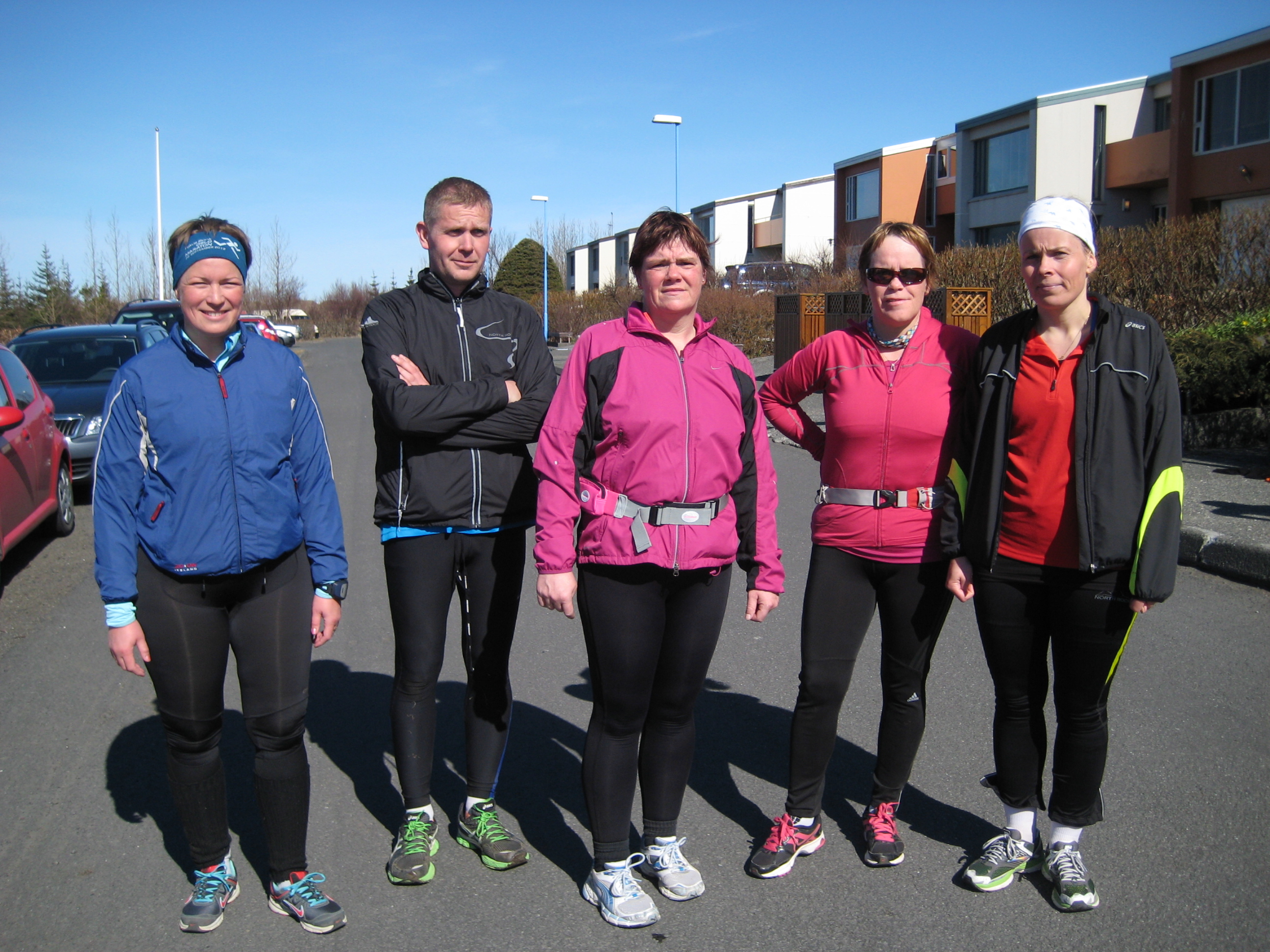 Um 9-leytið um morguninn hafði hópur af fallegu fólki safnast saman fyrir utan dyrnar hjá okkur hjónunum. Reyndar fréttist af enn fleira fallegu fólki sem hafði lagt í hann klukkutíma fyrr til að geta tekið hringinn á sínum hraða. Það er skynsamlegt að sníða sér stakk eftir vexti. Samtals voru það 9 manns og einn hundur sem stilltu sér upp til myndatöku  í morgunsólinni – og svo var lagt af stað sem leið liggur í átt til Akureyrar.