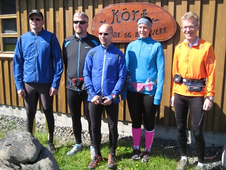 Rétt um hádegisbil vorum við stigin út úr bílnum við handverkshúsið Kört í Trékyllisvík. Þar hittum við fyrir þrjá hlaupara til viðbótar, þ.e.a.s. hjónin Hauk Þórðarson og Sigríði Júlíu Brynleifsdóttur, Skagfirðinga úr Borgarnesi – og Hólmvíkinginn Ingibjörgu Emilsdóttur. Eftir hefðbundna (fyrir)myndatöku var svo lagt af stað í blíðunni á slaginu 12:07, 7 mínútum á eftir áætlun. Framundan voru 53 kílómetrar og 8 klukkutímar af náttúrufegurð og hamingju.