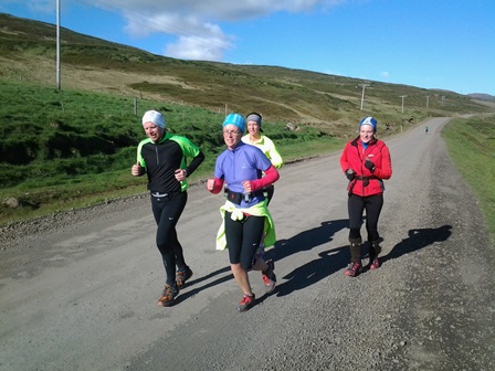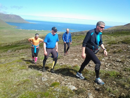 Enn vorum við 5 sem lögðum af stað frá Djúpavík. Ingibjörg sleppti reyndar heiðinni, enda var markmið hennar að ná 30 km hlaupum út úr deginum. Heiðinni var ofaukið í þeirri áætlun. Í hennar stað slóst Kolbrún Unnarsdóttir Hólmvíkingur og fjallahlaupari úr Mosfellsbænum í för með okkur. Og nú var Haukur aftur tekinn við í hjónaboðhlaupinu.