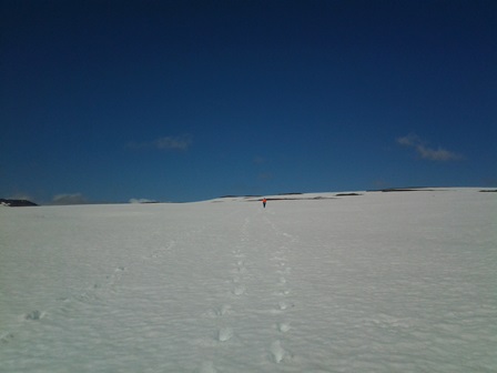 Klukkan 14:15 héldum við af stað frá Djúpavík, áleiðis inn dalinn fyrir aftan byggðina. Þar er greið gönguleið inn á Trékyllisheiði. Þennan spöl hafði ég reyndar aldrei farið og hafði því sett GPS-punkta af korti inn í Garminúrið mitt til öryggis. Þessa punkti þurfti ég svo sem ekkert að nota þegar til kom, enda leiðin auðrötuð í bjartviðri eins og því sem var þennan hamingjusama dag. En í stuttu máli má lýsa leiðinni inn á heiðina þannig að hún sveigi fljótlega upp í hjalla utan í fjallinu sunnan við dalinn sem þarna opnast. Þessum hjöllum er fylgt áfram í svipaða stefnu þar til komið er að Kjósará. Þegar yfir hana er komið tekur við greinilegur slóði sem auðvelt er að fylgja áfram inn á heiðina þar sem enn greinilegri slóði tekur við.