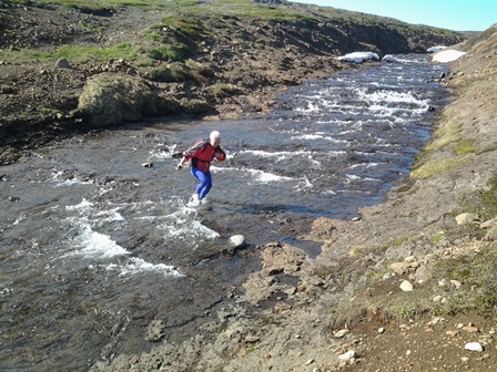 Leiðin inn hjallana innan við Djúpavík er ekki fljótfarin, en kl. 3 vorum við samt komin að Kjósaránni. Þangað eru rétt um 3,5 km frá Djúpavík og hækkunin eitthvað um 230 m. Þessi spölur hafði tekið okkur um 45 mín., sem telst ágætis yfirferð í landslagi eins og þarna er. Samkvæmt GPS-punktunum mínum virtist ráð fyrir því gert að við færum yfir ána neðst í svolitlu gili sem þarna er, þ.e.a.s. þar sem áin byrjar að dreifa úr sér. Þar hefði þó ekki verið hægt að komast yfir þurrum fótum, því að ár voru vatnsmiklar þennan dag. Því tókum við á það ráð að fara yfir ána á snjóbrú nokkru ofar.