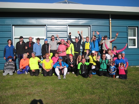 Hamingjusamir hlauparar í kvöldsólinni við lögreglustöðina á Kálfanesskeiði. Ef vel er talið má sjá þarna 29 andlit. (Ljósm. Björk Jóhannsdóttir).