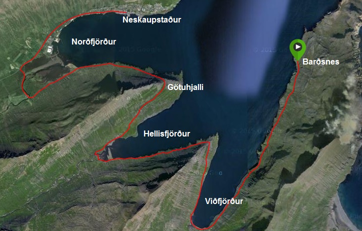 1. Barðsnes – Viðfjörður: 7,20 km, 35:42 mín, 4:58 mín/km