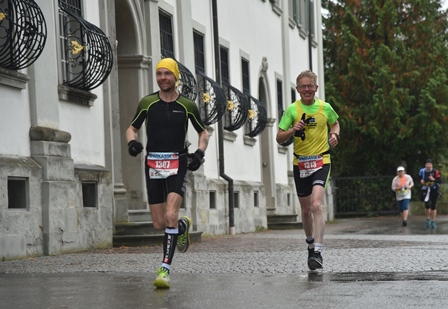 Hápunktur Þriggjalandamaraþonsins var eiginlega þetta augnablik við Mehrerau klaustrið í Bregenz. Ég hefði skilið Birki bónda í Tröllatungu eftir við 5 km markið, en þarna birtist hann allt í einu, búinn að hlaupa 40,7 km, og svo bara hvarf hann! (Ljósm. Alphafoto).