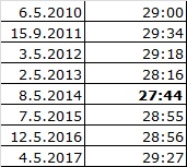 Ég sleppti bæði Víðavangshlaupi ÍR og Vormaraþoni FM þetta árið enda enn hundslappur eftir veikindi sem herjuðu á mig um páskana. Sjöunda hlaup árins var því Icelandair-hlaupið (7 km) 4. maí, 8. árið í röð, í vestan golu, sól og 14 stiga hita. Lauk þessu hlaupi á 29:27 mín og um kvöldið skrifaði ég þetta: „Vonaðist til að vera ekki á PW (>29:34) en taldi allt umfram það vera í plús. Leit aldrei á klukkuna og leið vel allan tímann“. Þetta var allt í samræmi við raunsæjar væntingar og dugði auk heldur til sigurs í flokki 60 ára og eldri. Og í töflunni hér til hliðar má sjá árangur minn í öllum Icelandairhlaupum sem ég hef tekið þátt í. Þarna er engin stórvægileg sveifla.