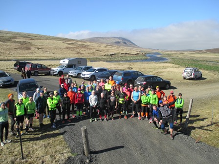 Stærsti fjallvegahlaupahópur allra tíma í þann veginn að taka á rás frá Hrafnhólum norður yfir Svínaskarð. (Ljósm. Guðmundur Sigurbjörnsson).