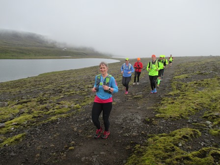 Hamingju- og fjallvegahlaup yfir Bæjardalsheiði. Kolbrún Unnarsdóttir fremst meðal jafningja – og þarna vorum við líklega nýbúin að villast.