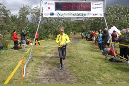 Eftir Laugaveginn hafði ég hægt um mig í hlaupunum, enda ekki aðrir kostir í stöðunni. Lét mér nægja að horfa á Gittu mína og alla hina hlauparana í fyrsta Dyrfjallahlaupinu 22. júlí – og svo naut ég lífsins með Björk og skyldmennum í gönguferðum fyrir austan, með fatlann. Mætti svo óæfður í hálft maraþon í RM 19. ágúst. Það gekk furðu vel. Hljóp fyrstu 10 km á 44:53 mín og næstu 10 líka á 44:53 mín. Hraðinn var sem sagt býsna jafn alla leið, lokatíminn var 1:34:30 klst. og ég vann aldursflokkinn. Ég var óvenju heppinn með aldursflokk þetta árið! Þetta var framar vonum og líklega ekkert útilokað að ég gæti hlaupið gott Þriggjalandamaraþon um haustið. Þarna voru enn 7 vikur til stefnu.