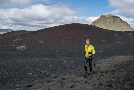 Uppáhaldshlaupamyndin mín frá árinu 2017, tekin á Laugaveginum á söndunum norðan við Emstrur, með Hattfell í baksýn. (Ljósm. Pascale Dengis, (belgísk kona sem átti þarna leið um með fjölskyldunni)).