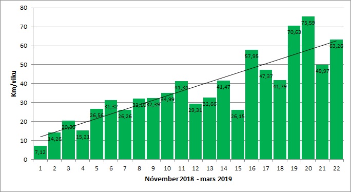 Hlaupnir km í hverri viku nóv 2018 – mars 2019 ásamt aðhvarfslínu sem sýnir þróunina. (Stærri mynd birtist sé smellt á þessa).