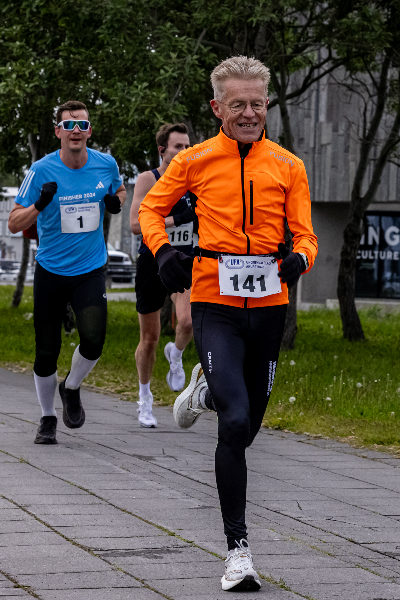 Þriðja 5 km hlaupið var svo Akureyrarhlaupið 4. júlí. Þá hefði þetta svo sem getað smollið, en norðanvindur og kuldi gerðu þetta allt svolítið erfiðara. Sá fljótt hvert stefndi, endaði á 22:11 mín og var bara vel sáttur. Svo hitti ég líka slatta af góðu fólki. Það er alltaf gott að hlaupa á Akureyri!