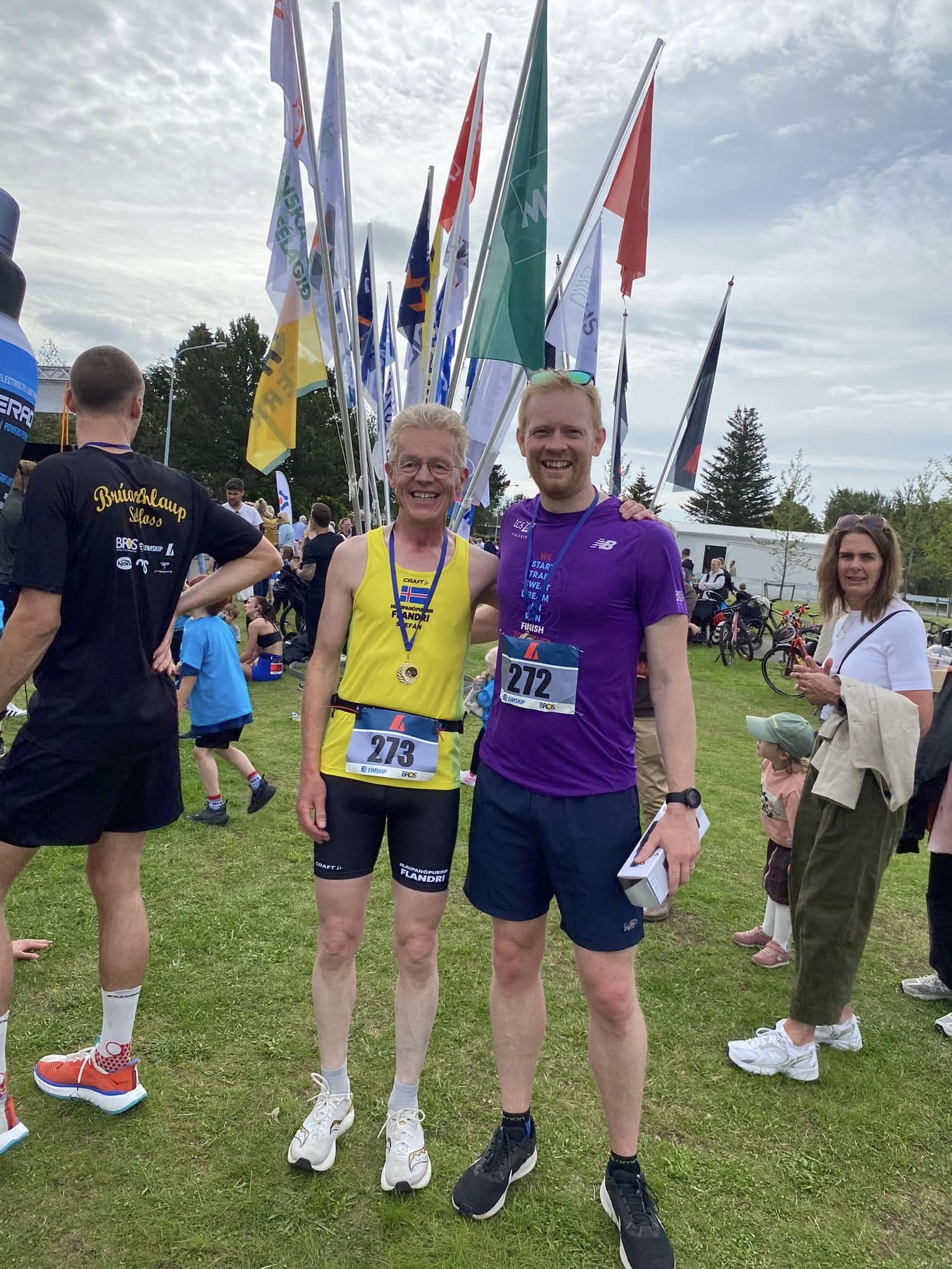 Fjórða og síðasta hlaupið í „EÍE-verkefninu“ var Brúarhlaupið á Selfossi 10. ágúst. Þar hafði ég fulla trú á að markmiðið næðist, m.a. eftir að hafa fundið neistann í góðum utanvegahlaupum (sjá neðar). Veðrið var líka eins og best verður á kosið, brautin óaðfinnanleg – og fjölskylduvinurinn Hjalti Rögnvaldsson kominn alla leið frá London til að „héra“ mig. Hann stóð sig fullkomlega í því hlutverki, allir kílómetrar voru á nokkurn veginn réttum hraða (undir 4:20 mín/km) og lokatíminn 21:28 mín. Þar með átti ég Íslandsmetið einn – og verkefninu var lokið. (Reyndar er rétt að halda því til haga að svona lagað kallast að réttu aldursflokkamet en ekki Íslandsmet, en hafa skal það sem skemmtilegra reynist. Alla vega er þetta besti tími sem 65-69 ára íslenskur karl hefur náð í vottuðu 5 km götuhlaupi. Ég veit að ég mun ekki eiga þetta met lengi, en er á meðan er).