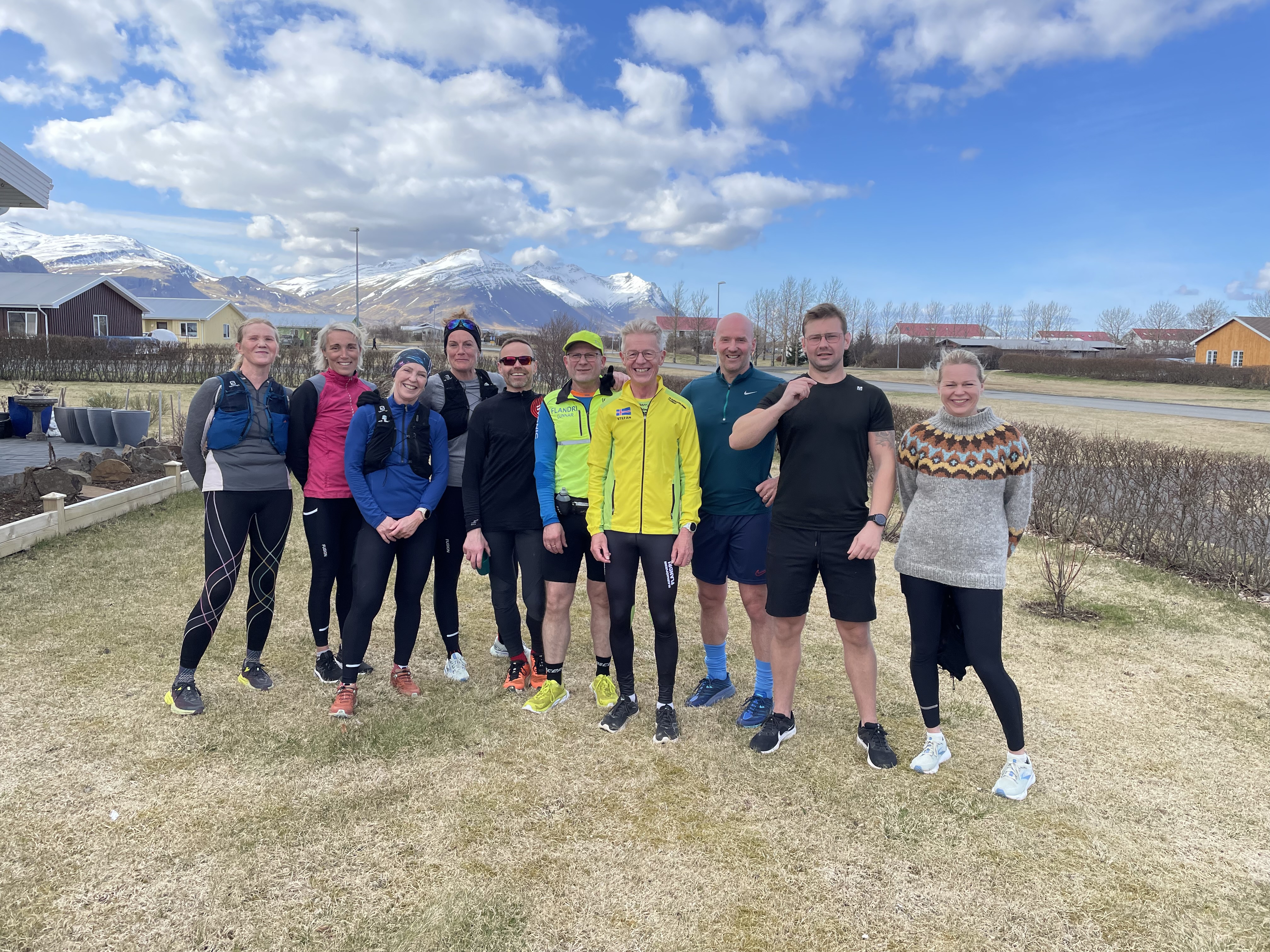 Helsta „Skemmtihlaup“ ársins var hið árlega Uppstigningardagshlaup, en síðan árið 2010 höfum við hjónin boðið í hálfmaraþon og mat (í þeirri röð) á uppstigningardag ár hvert (að árinu 2021 frátöldu). Lengst af var hlaupaleiðin hinn sívinsæli Háfslækjarhringur með upphaf og endi í Borgarnesi, en eftir að við hjónin fluttum yfir á Hvanneyri haustið 2021 þurfti náttúrulega að finna nýja og álíka langa leið. Að þessu sinni lá leiðin „niður í Land“ eins og heimamenn kalla það – og síðan upp að Vatnshömrum og þar áfram Heggsstaðahringinn upp á Hvítárvallaflóa og aftur heim. Að þessu sinni bar uppstigningardag upp á 9. maí og hópurinn taldi samtals 10 hlaupara. Veðrið lék við okkur eins og næstum alltaf og súpan hennar Bjarkar eftir hlaup var það allra besta.