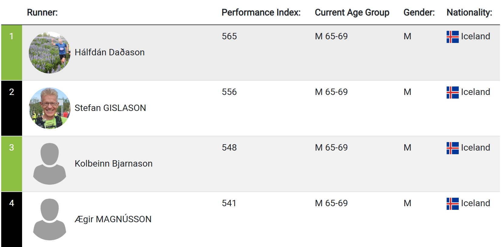 - Efsta sæti á ITRA-lista 65-69 ára á Íslandi
