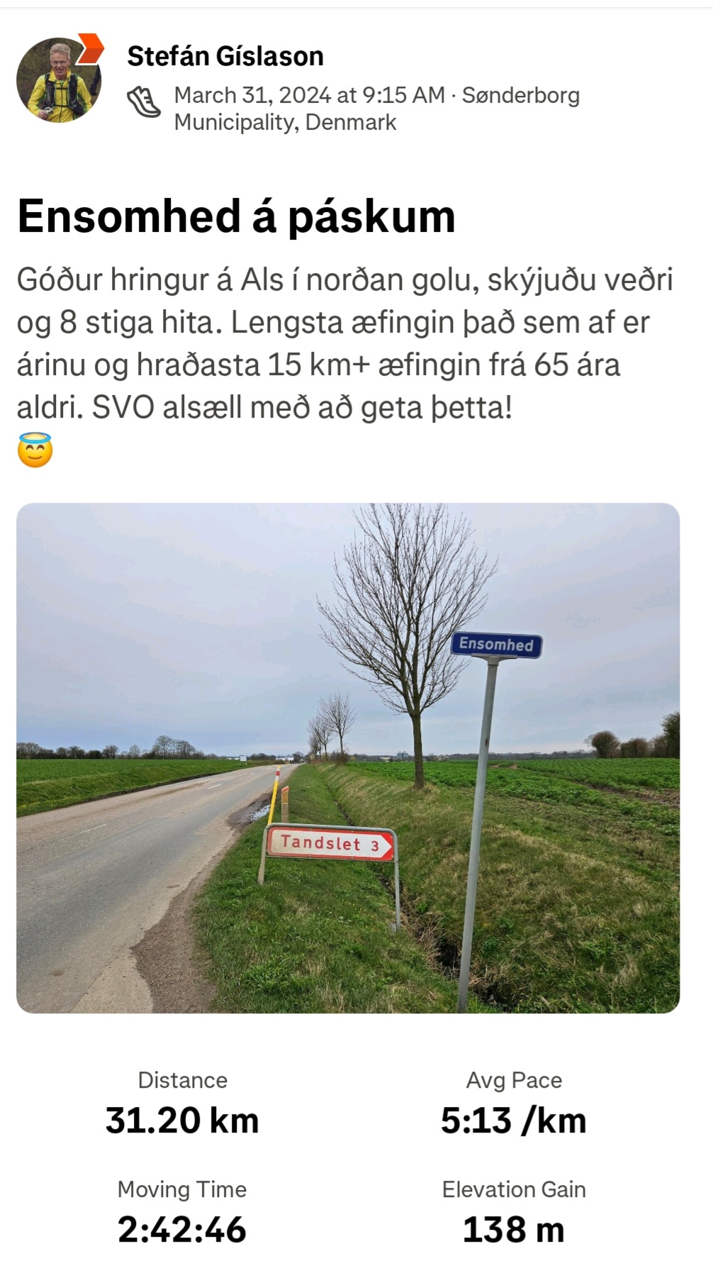 Í lok mars skruppum við Björk í vikuferð til bróður hennar og mágkonu í Danmörku og þar átti ég bestu hlaupaviku ársins, alsæll með að vera laus við norðanáttina. Reyndar var hitastigið ekki mikið hærra en í Andakíl, en lognið gerði gæfumuninn. Þarna kynntist ég því líka í fyrsta sinn hversu gott það er að taka hraðar æfingar á „carbonplötuskóm“, Þetta voru eins og bestu æfingabúðir fyrir mig, sjö daga törn með samtals 91 km með þéttum gæðaæfingum og 30 km laugardegi á 5:13 mín/km. Eftir þessa viku fundust mér allir vegir færir.