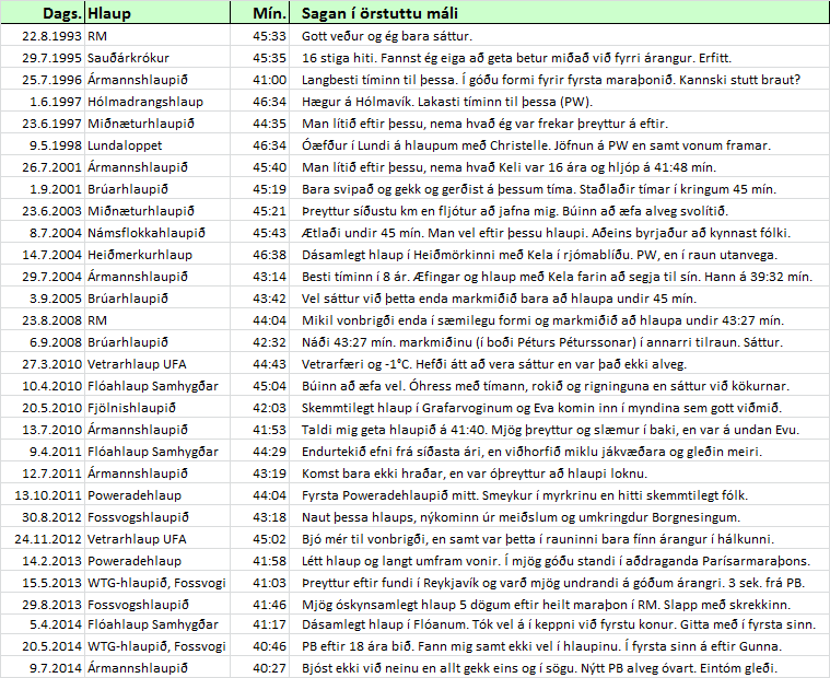 Maður æfir svo sem ekki í heilt ár fyrir maraþonhlaup, eða það geri ég í það minnsta ekki. Engu að síður finnst mér skynsamlegt að sjá ár fram í tímann á hlaupabrautinni, er svo má að orði komast. Þarna var sem sagt búið að taka ákvörðun um að maraþonið í München yrði aðalhlaupaverkefni ársins 2014, sem þýddi að önnur verkefni hlutu að taka mið af því eftir því sem nauðsyn krafði. Í mínu tilviki þýddi þetta að ég lagði frekar litla áherslu á löng hlaup yfir vetrarmánuðina og reyndi þess í stað að byggja upp vöðvastyrk og hraða. Aðgerðir í þá veru hefðu svo sem getað verið markvissari, en allt ræðst þetta jú að hluta til af öðrum aðstæðum, þ.m.t. heimafyrir og í vinnunni. Eina nýjungin sem ég bætti við fyrri æfingar voru 10 hnébeygjur með 12 kg ketilbjöllu inni á baðherbergi á hverjum einasta morgni, allt frá því að Þorkell sonur minn gaf mér umrædda bjöllu á jólunum 2013. Svo hljóp ég bara þessa venjulega 40-50 km á viku, ýmist með félögum mínum í Flandra eða einn míns liðs, svona rétt til viðhalds. Þetta virtist virka ágætlega. Alla vega kom ég vel undan vetri, sem endurspeglaðist í persónulegum metum (hér eftir nefnd „PB“) í 5 km og hálfu maraþoni seint í apríl. Í maí féll svo persónulega metið í 10 km (41:00 mín) sem hafði staðið sem fastast í 18 ár. Ég hlaut sem sagt að vera á réttri leið, alla vega að einhverju leyti.