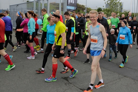 Hlaupið var ræst með látum stundvíslega kl. 10:00. Ég fylgdi straumnum til að byrja með og Gísli var skrefi á undan til að byrja með. Fljótlega greiddist úr hópnum og þar með var hlaupið hafið fyrir alvöru. Gísli seig fram úr og hvarf mér smám saman sjónum en ég hafði það samt á tilfinningunni að upphafið væri nokkurn veginn eins og ég hafði ætlað. Reyndar var erfitt að átta sig á hraðanum því að Garminúrið sló úr og í, ef svo má að orði komast, sýndi stundum 3:30 mín/km og stundum 4:50. Ég vissi að hvorugt var rétt, enda var Sævar búinn að vara okkur við því að gervihnattasambandið gæti verið óstöðugt inni í borginni, inni á milli húsa og inni á milli trjáa.
