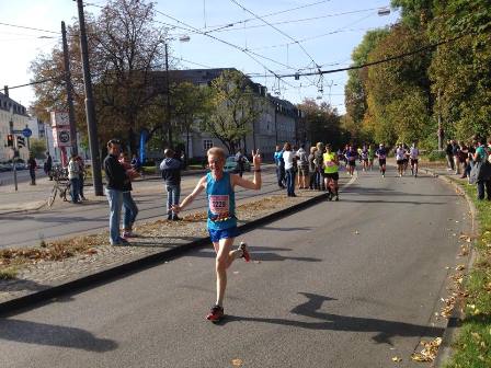 Hálfmaraþonmarkið er alltaf tilhlökkunarefni í maraþonhlaupum, því að þar gefst nýtt tækifæri til uppbyggjandi útreikninga. Í þessu tilviki gat ég líka hlakkað til að sjá eitthvað af hálfmaraþonhlaupurunum, sem voru sjálfsagt mættir á svæðið þótt enn væru meira en 2 klst. í að hlaupið þeirra yrði ræst. Ég kom reyndar ekki auga á marga sem ég kannaðist við, en Gunnar Atli var þó alla vega þarna á kantinum að hvetja samferðamennina. Hálfmaraþontíminn var 1:32:21 klst., sem var meira en 2 mín. betri tími en ég hafði áður náð í maraþonhlaupi. Samkvæmt því mátti halda að auðvelt yrði að bæta PB-ið, en ég bæði vissi og fann að það væri alveg á mörkunum. Reynslan sagði mér að seinni helmingurinn gæti sem best tekið um 3 mín. lengri tími en sá fyrri. Þar með væri lokatíminn kominn í 3:08 klst., sem þýddi að ekkert mátti út af bera til að markmiðið næðist. Í Reykjavíkurmaraþoninu í fyrra var ég reyndar talsvert fljótari með seinni helminginn en þann fyrri, hljóp á „negatívu splitti“ sem sagt, en svoleiðis gerist bara á hátíðis- og tyllidögum. Nú voru líkurnar á slíku nær engar að teknu tilliti til æfinga undanfarinna mánuða og þess hvernig hlaupið hafði þróast.