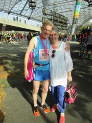 Sunnudagurinn 12. október rann upp bjartur og fagur. Að vísu er þessi staðhæfing ekki alveg sönn ef fyllstu nákvæmni er gætt, því að snemma um morguninn lá svolítil þoka yfir München og hitastigið var ekki nema rétt um 10°C. Þeir sem voru skráðir í heilt maraþon söfnuðust saman í anddyri hótelsins um 8-leytið, og á slaginu 8:07 var lagt af stað með sporvagninum áleiðis á Ólympíuleikvanginn þar sem hlaupið átti að hefjast kl. 10:00 og ljúka tiltölulega skömmu síðar. Við Gunnar Viðar héldum uppi merki Flandra og Borgarfjarðar í þessum hópi. Þrjú hinna stefndu á hálfa maraþonið sem átti að hefjast 4 klst. síðar og lífsförunautarnir Björk og Kristín hugðust taka sporvagn að endamarkinu í tæka tíð til að taka á móti okkur. Þetta síðastnefnda er reyndar ekki auðvelt verk í hlaupum eins og þessum þar sem maður er ókunnugur marksvæðinu og þar sem erfitt getur reynst að finna hvert annað í mannmergðinni.