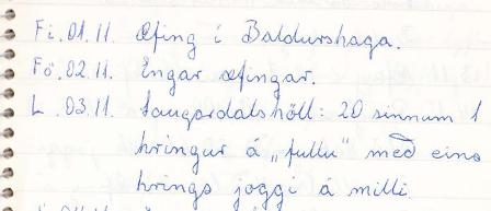 Ég man reyndar ekkert eftir þessu fimmtudagskvöldi í nóvemberbyrjun 1973. Og í æfingadagbókinni stendur ekkert nema „Æfing í Baldurshaga“. Hins vegar man ég eftir samtali við Guðmund heitinn þegar hann spurði mig hvaða greinar ég ætlaði að æfa, og ég sagðist ætla að sérhæfa mig í millivegalengdahlaupum og þrístökki. Ég held að hann hafi ekki alveg tekið mark á þessu með þrístökkið, en sjálfur þóttist ég vera álíka efnilegur í því eins og í hlaupunum, enda árangurinn eitthvað svipaður skv. stigatöflu. Líklega var ég á „Topp-5 listanum“ á Íslandi yfir 15-16 ára gutta í hvoru tveggja þetta árið.