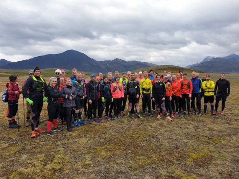 Eftir 7-8 km fannst mér kominn tími til að fækka fötum, sem tók svolitla stund því að bakpokinn þvældist fyrir. Í honum var skyldubúnaður samkvæmt reglum hlaupsins, þ.m.t. regnföt, álteppi og fullhlaðinn sími, sem er auðvitað öryggistæki í utanvegahlaupi, kannski samt ekki í þessu tiltekna hlaupi þar sem leiðin var nánast öll utan þjónustusvæðis farsímakerfa. En maður hefði þá alla vega getað skoðað myndir af fjölskyldunni á meðan beðið var eftir hjálp sem ekki var hægt að hringja í.