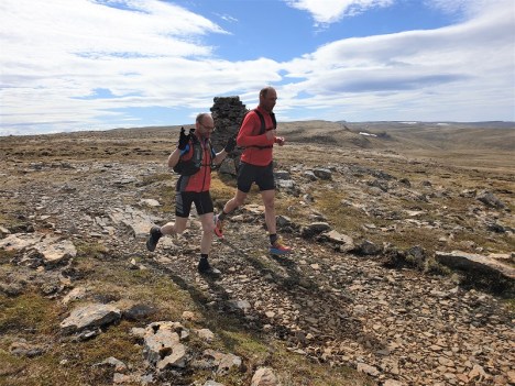 Birkir birtist við Lewis Burn kl. 17:08 og Gunnar nákvæmlega 48 mínútum síðar. Báðir voru hinir kátustu, þó að auðvitað væri þreytan farin að segja til sín eftir 86 km hlaup. Gunnar sló á létta strengi við starfsfólkið á drykkjarstöðinni sem þáði þó ekki boð hans um bita af sviðasultunni sem hann var með í nesti. Samt útskýrði hann skilmerkilega úr hverju þessi eðalfæða væri gerð. Stórskrýtnir þessir Bretar! Þess má reyndar geta að Birkir og Úlfhildur höfðu bæði tekið sams konar góðgæti með sér að heiman. Hlaupagel eru sennilega orðin úrelt.