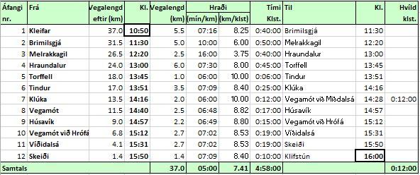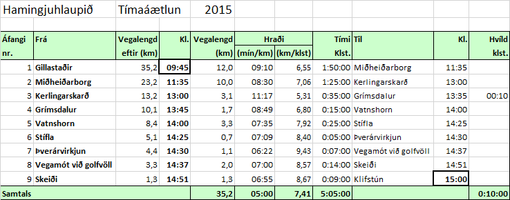 Rétt er að minna á að Hamingjuhlaupið er ekki keppnishlaup, heldur halda hlaupararnir yfirleitt hópinn og fylgja fyrirfram gerðri tímaáætlun sem svipar mjög til strætisvagnaáætlunar. Áætlunin fyrir Hamingjuhlaupið 2017 fer hér á eftir.