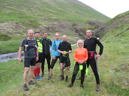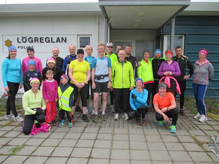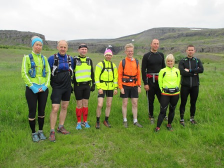 Hamingjuhlaupið 2009. Þarna byrjaði þetta allt saman – á Drangsnesi. F.v.: Arnfríður, Birkir, Guðmann, Ingimundur, Stefán, Þorkell og Eysteinn.