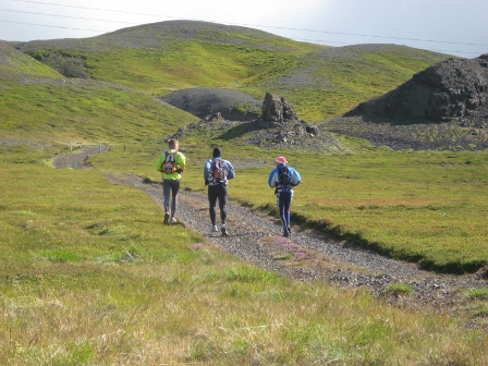 Hamingjuhlaupið 2016. Á Bjarnarfjarðarhálsi með Birki, Hauk og Noémie fremstum meðal jafningja.