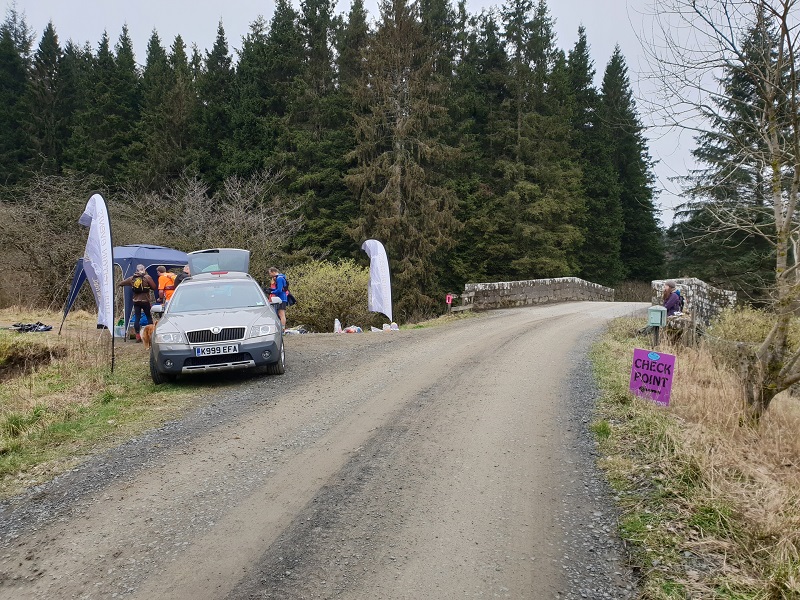 Eftir að hafa mokað í mig hitaeiningum á marksvæðinu settist ég með nokkrum erfiðismunum inn í bíl og ók sem leið lá áleiðis að drykkjarstöðinni við ána Lewis Burn þar sem ég hafði sagst ætla að hvetja félagana. Samkvæmt tímaáætlun sem ég gerði fyrir hlaupið var von á Úlfhildi þangað í fyrsta lagi kl. 14:30, en við þessa stöð voru 36 km búnir af 50 km hlaupinu. Ferðalagið þangað tók mig drykklanga stund, því að almenningi var bannað að fara þangað keyrandi. Ég þurfti því að leggja bílnum á bílastæði niður við lónið og komast á tveimur jafnfljótum um 2,5 km leið upp með Lewis Burn. Hvorugur þessara tveggja jafnfljótu var fljótur í förum þennan spöl, enda krampar í þeim báðum. Það tók mig nánar tiltekið 23 mín. að skakklappast þennan spotta, sem var að vísu heldur á fótinn. Var kominn á áfangastað kl. 14:33 og þá var Úlfhildur löngu farin hjá að sögn starfsmanna á drykkjarstöðinni. Það voru að vissu leyti vonbrigði en þó fyrst og fremst gleðiefni, því að þetta þýddi að hún var komin langt á undan áætlun.