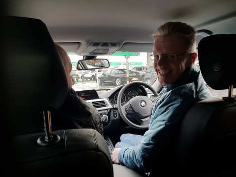 Áður en við lögðum af stað í þessa ferð hafði Gunnar lýst því yfir að hann kviði ekkert fyrir því að hlaupa þessa 100 km. Verra væri að þurfa að keyra 200 km – á öfugum vegarhelmingi. Svoleiðis keyrir fólk nefnilega í Bretlandi. Til að gera langa sögu stutta gekk þessi vinstrikantskeyrsla stóráfallalaust, þó að í eitt eða tvö skipti hafi hurð skollið nærri hælum – eða vinstri hlið nærri vörubíl. Hins vegar fær konan í leiðsögutækinu í bílaleigubílnum ekki háa einkunn fyrir leiðsögnina. Ef einhver Grjótháls væri á Englandi hefðum við örugglega keyrt yfir hann – og ef þar væri einhver Siglufjörður hefðum við komið þar við á Laugarvegi. Þess vegna varð tveggja tíma keyrsla á öfugum kanti að fjögurra tíma keyrslu á svo mjóum sveitavegum að þar þurfti að nota báða kanta jöfnum höndum og samtímis.